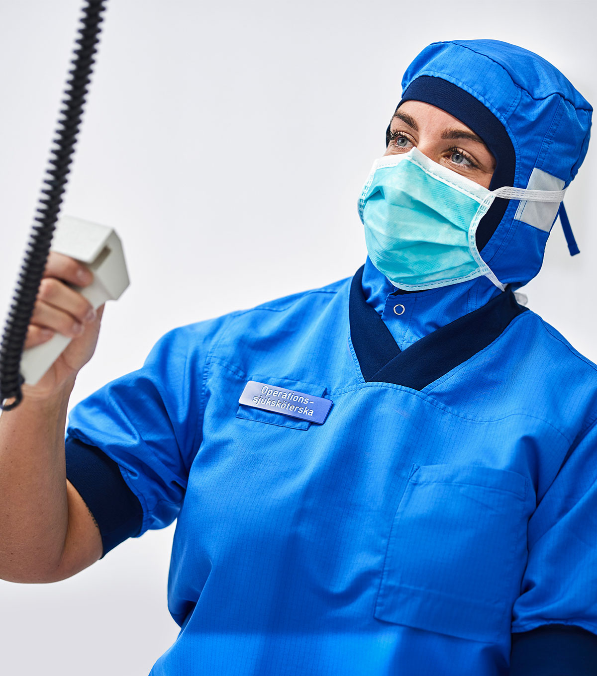 Materialet är certifierat enl. EN13795-2 och är mjukt och behagligt mot huden. Microfibern är ett snabbtorkande material som andas och är mycket slitstark. Plagget är anpassat för höga tvättemperaturer. Längd mitt bak 80 cm i storlek Medium.